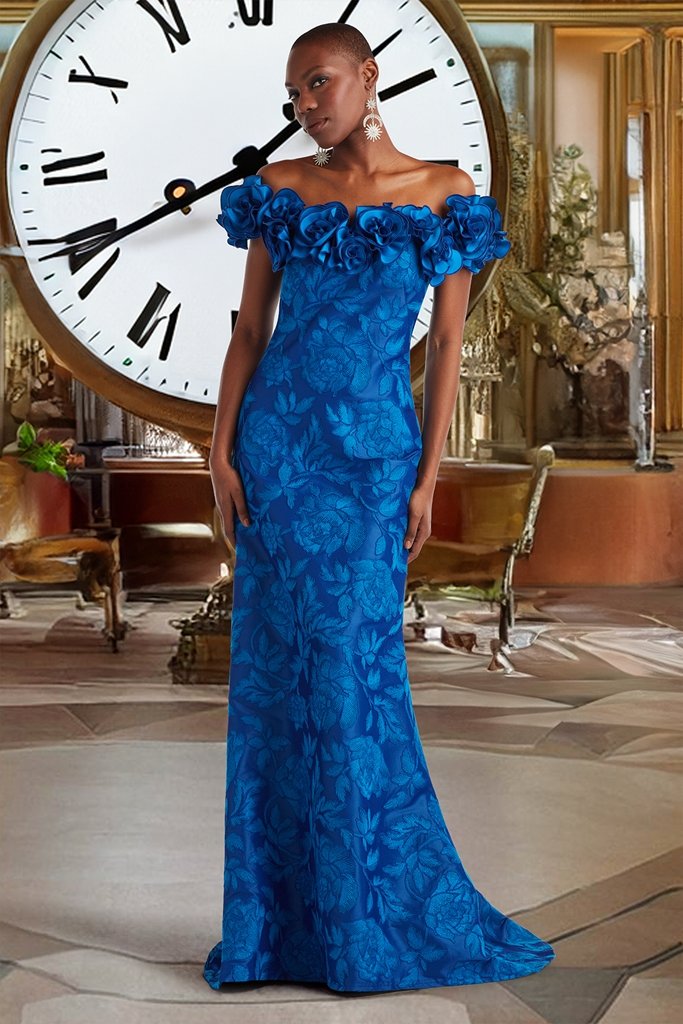 At the heart of the collection are fabrics that embody the romance of time’s journey. Satin-piped textured crepe echoes the graceful motion of ticking clocks and ancient sundials. Laser-cut motifs in textured crepe and velvet revive beloved motifs, breathing life into timeless patterns. Shutter pleats in textured crepe evoke the structured elegance of archival details, a testament to brand heritage. Fine embroidery on tulle captures the intricate mechanics of clocks, a ballet of gears and springs brought to life in thread. Paillette-embroidered tulle shimmers like sand cascading through an hourglass, while a luminous organza jacquard flows across the collection like stardust drifting through the moon phases of a celestial sky. The luxury-within-reach collection of evening gowns, tea-length dresses, and cocktail looks are priced between $300 and $700.